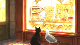 ブラッキーとポウ、パンを食べる黒猫のブラッキーは、町外れの港で暮らす“食いしんぼう”の猫。今日も、かもめのポウと一緒に海辺を散歩していました。「ねぇポウ、なんだかいい匂いがしない?」ブラッキーが鼻をひくひくさせると、風に乗ってふわっとあたた...